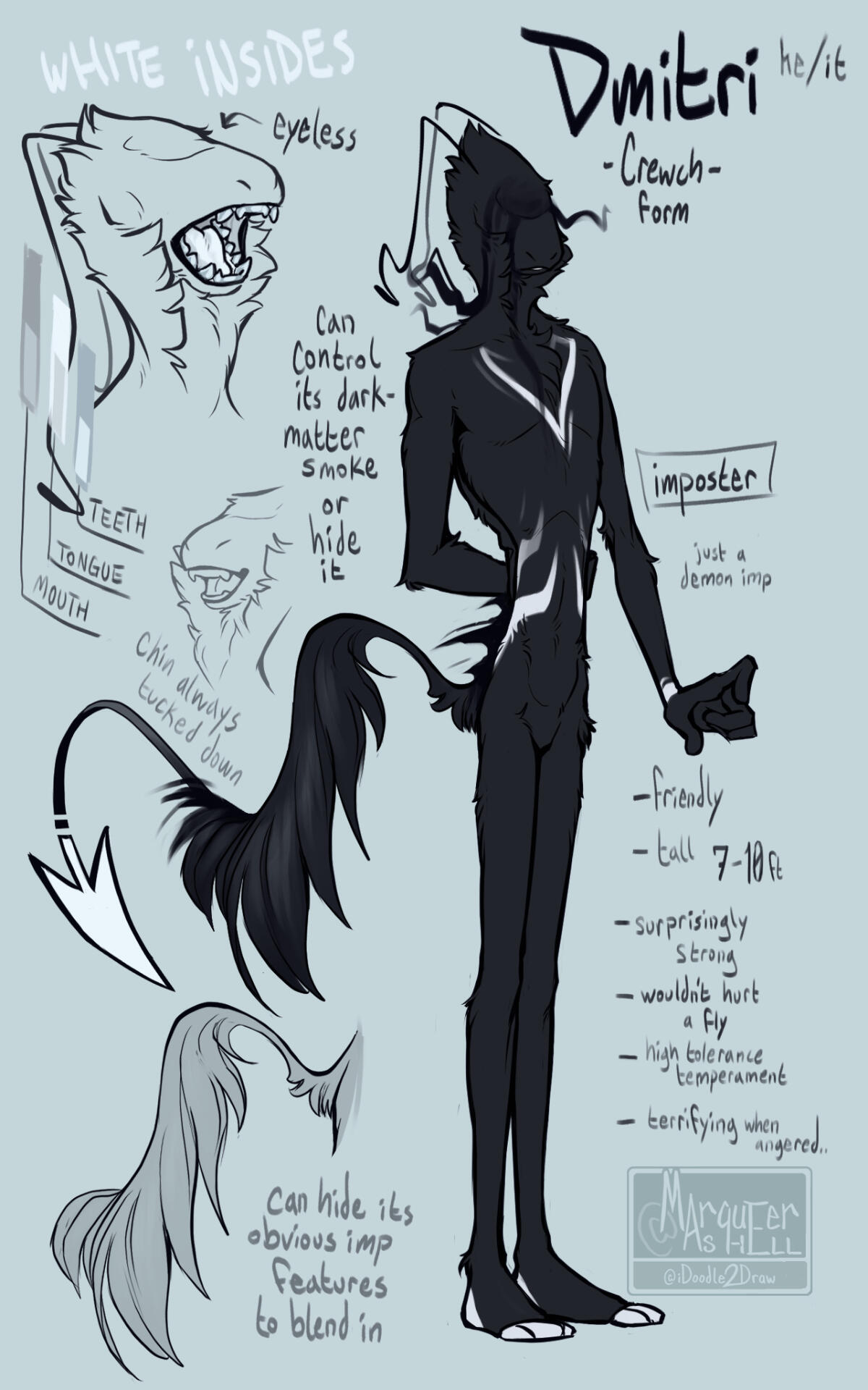 _Features include:** Para imposter eyes [thick black "eyeliner" corners, near-black sclera, 3 irises], an onimous aura [heavily repulsive for Crewches, if they can sense it], horns continued to grow [past typical Crewch limit], can see the dead [ghosts].