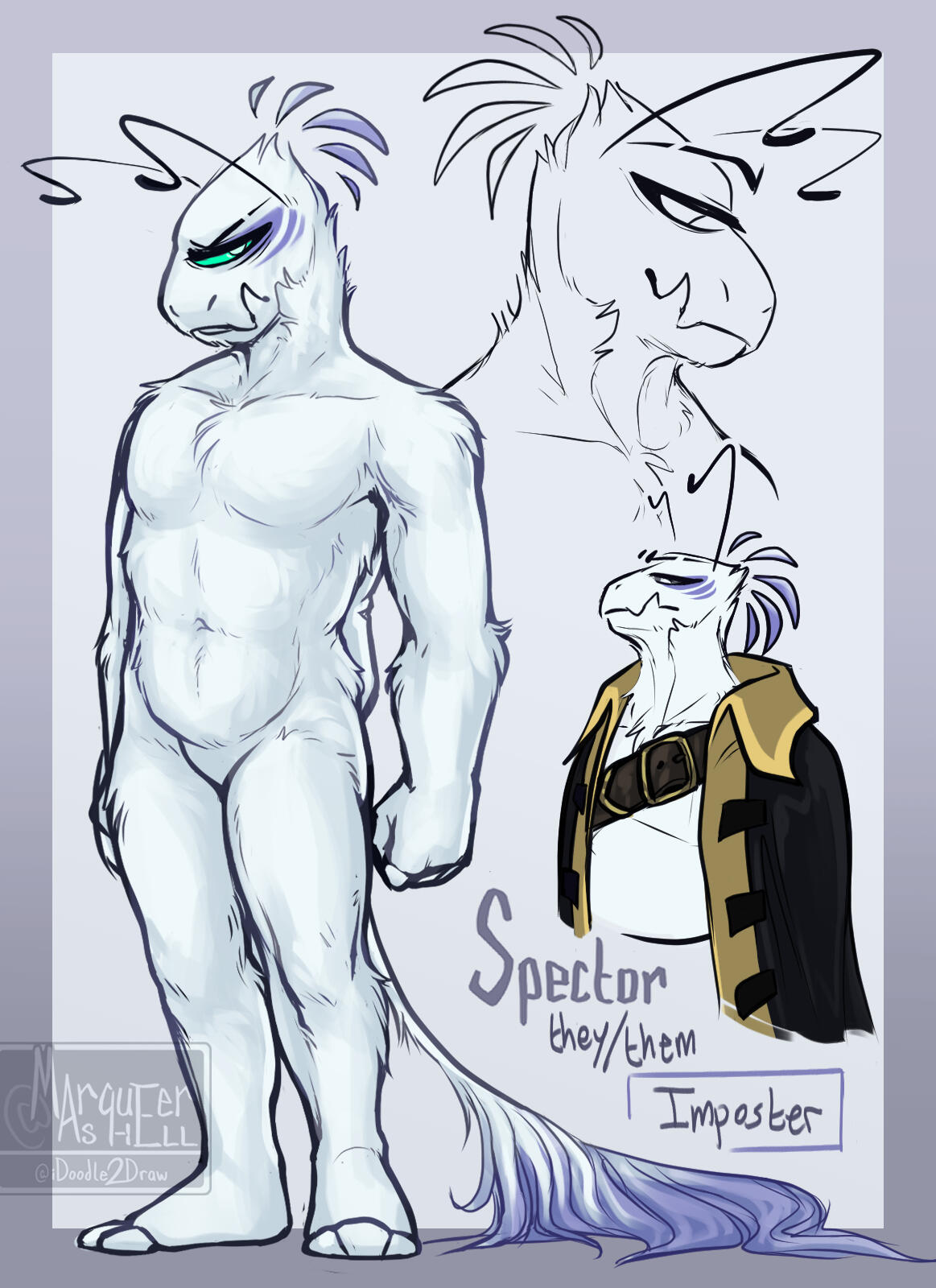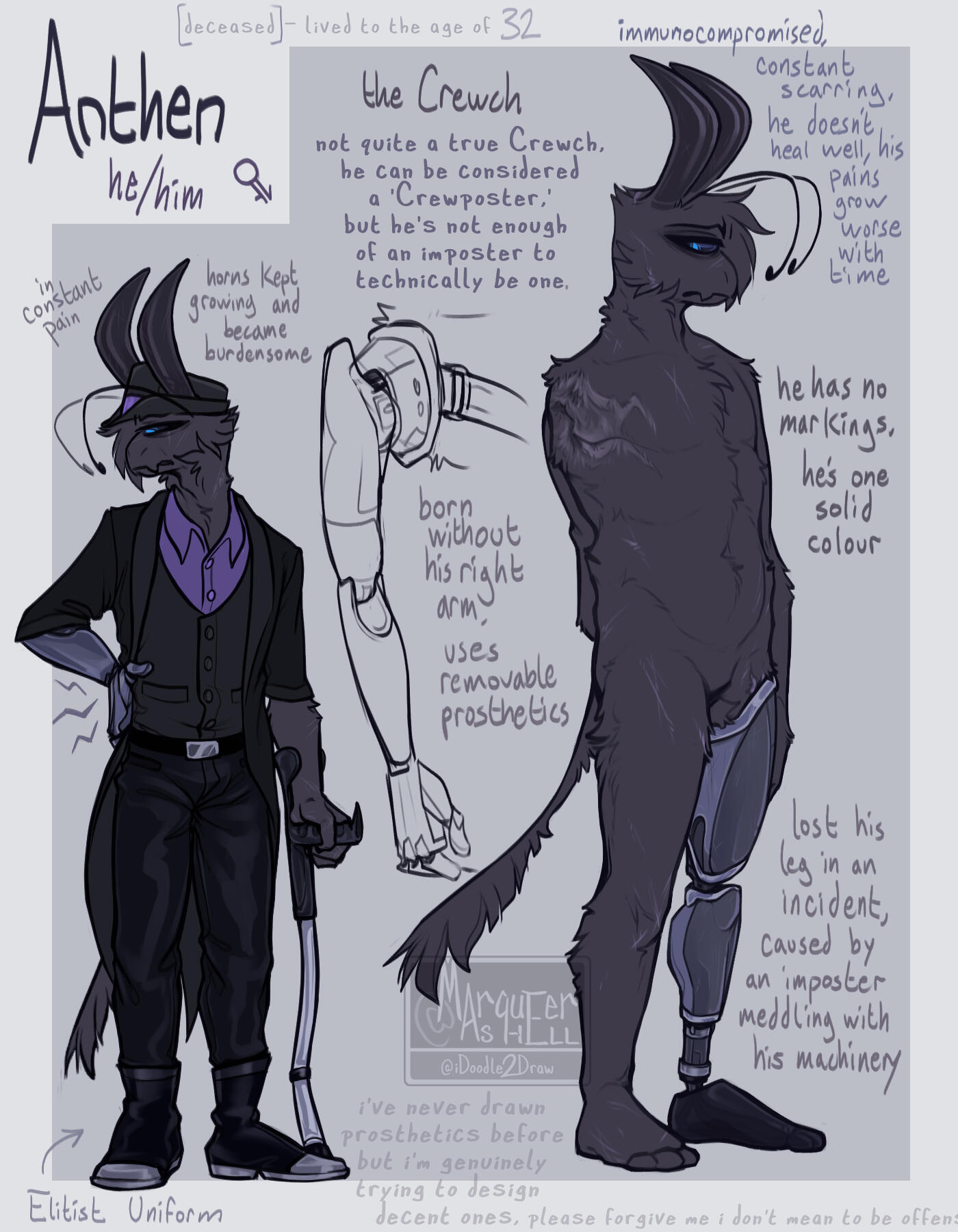 Quite the tragic character, Anthen was born an unfortunate life. Despite given the 'Crewposter' label, he technically isn't enough of an imposter to be considered as one.[lots of sciencey talk - CW // pregnancy terms] He was going to be born normally, until early in the pregnancy, his mother was afflicted by a 'hit and run' from an imposter. In the womb, he partially absorbed his fraternal twin- thusly causing several issues in his genetic makeup; he became an odd crewch + imposter gene soup. Some cases of twin absorption causes them to inherit those twin's genes; some even get two completely opposite immune systems. This resulted in him being permanently immuno-compromised [if they get sick or injured, their body might attack itself]. He lost his right arm + hand during the absorption [mutual absorption]._Anthen, despite being some odd type of hybrid, is completely harmless. He has the body and anatomy of a true Crewch, with a few imposter features sprinkled in.